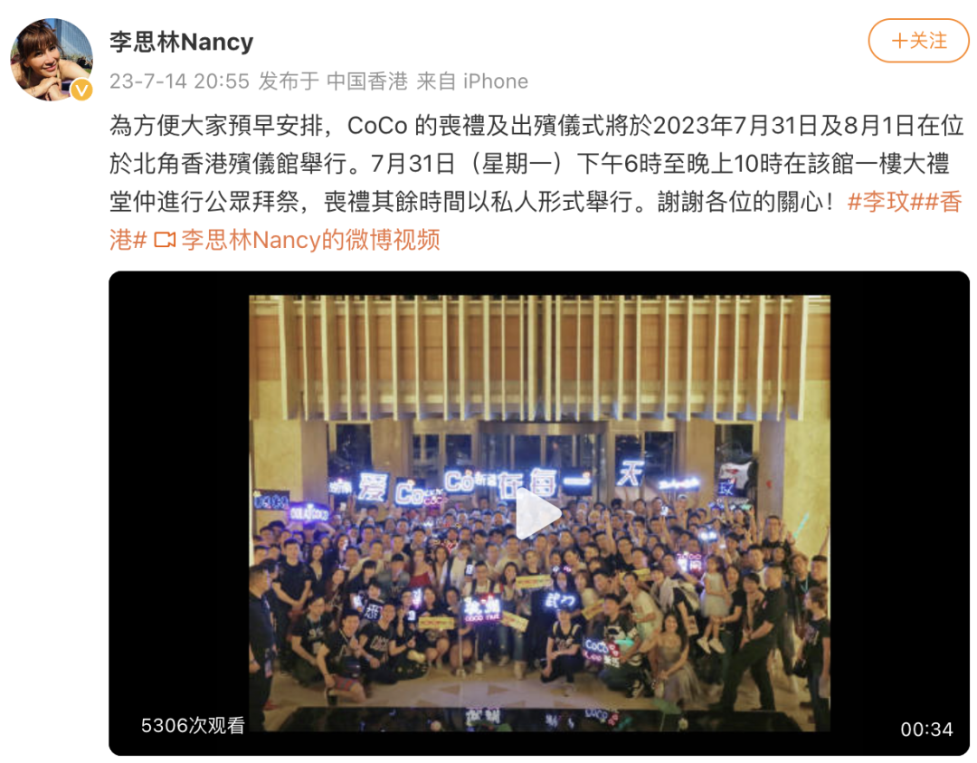 7月14日晚,李玟姐姐李思林微博发文:为方便大家预早安排,CoCo 的丧礼及出殡仪式将于2023年7月31日及8月1日在位于北角香港殡仪馆举行。7月31日(星期一)下午6时至晚上10时在该馆一楼大礼堂中进行公众拜祭,丧礼其余时间以私人形式举行。谢谢各位的关心!
