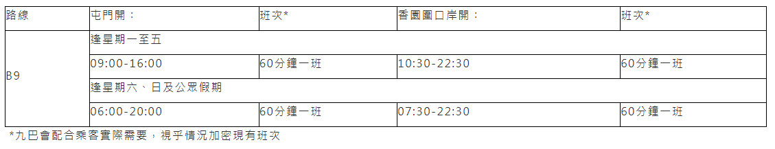 九巴日前宣布,由今日(8月1日)至9月1日期间,提升路线B9 [屯门站香园围口岸]至每日服务,更方便市民和游客于暑假期间来往内地和香港。