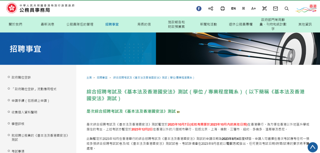 另外,新一轮综合招聘考试及《基本法及香港国安法》测试(学位/专业程度职系)今日(4日)起接受报名,截止报名日期为8月17日下午5时。此轮考试暂定于10月7日举行。