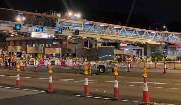 东隧来回方向及相关支路凌晨4时临时封闭,至5时重开。期间工作人员以黑布盖起收费停,改用「易通行」指示牌,并封闭部分行车线。早上东隧车辆数目不多,交通大致畅顺。「易通行」实施后,东隧往港岛方向近收费广场行车线减至4条,往九龙方向近收费广场行车线减至3条。