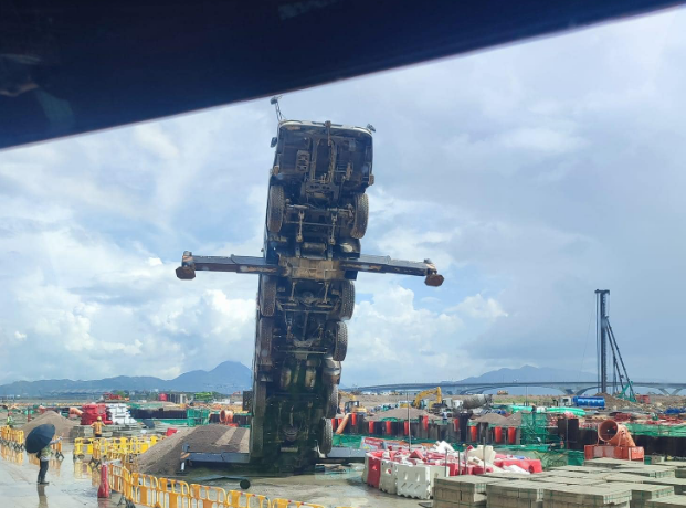 今日(28日)上午9时许,东涌有地盘的重型吊臂车突然向后翻倒,整部车翻起,幸无人受伤。