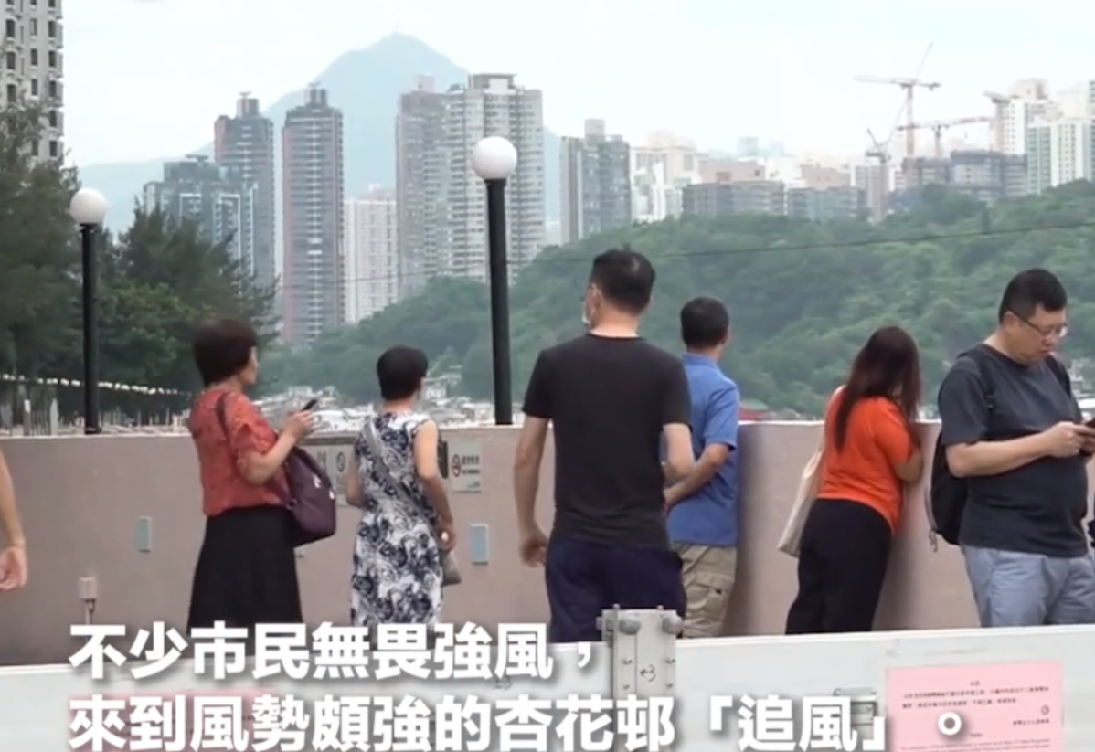 超强颱风“苏拉”今日(9月1日)吹袭香港,天文台现正悬挂8号西北烈风或暴风信号。天文台考虑在下午6时至8时之间发出九号烈风或暴风风力增强信号。不少市民无畏强风,来到风势颇强的杏花邨“追风”。