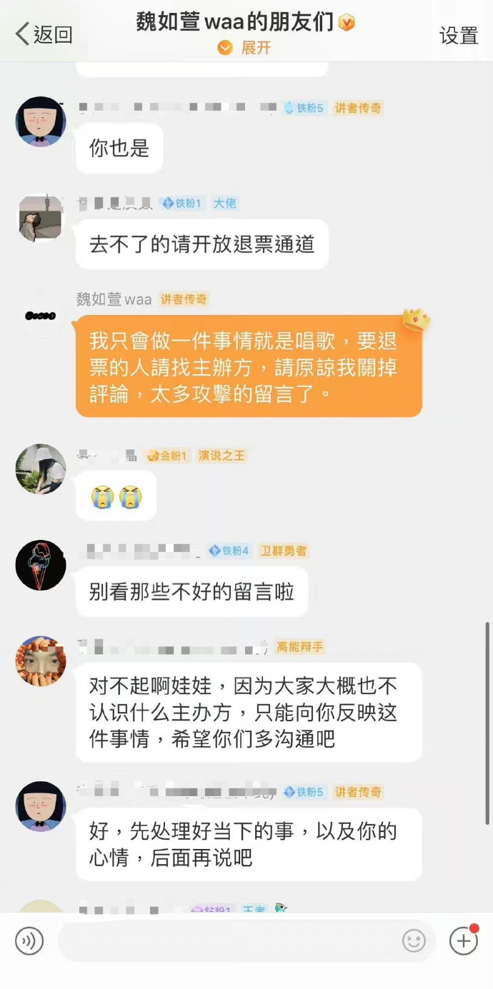 亦有网民于微博分享魏如萱在内地粉丝群的言论,有歌迷向魏如萱建议让未能到港的歌迷退票,魏如萱回覆:“我只会做一件事情就是唱歌,要退票的人请找主办方,请原谅我关掉评论,太多攻击的留言了。”