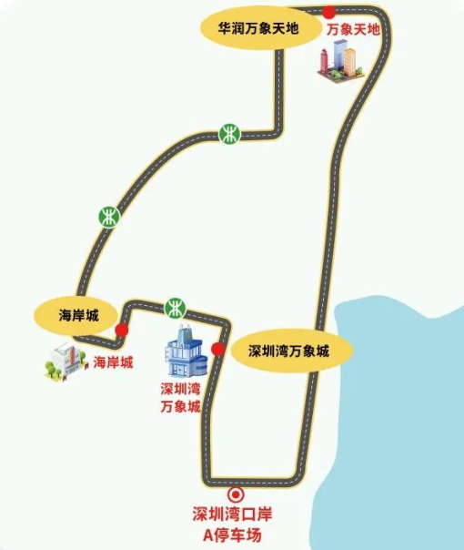 消费文旅A线:深圳湾口岸A停车场→深圳湾万象城→海岸城→华润万象天地→深圳湾口岸A停车场