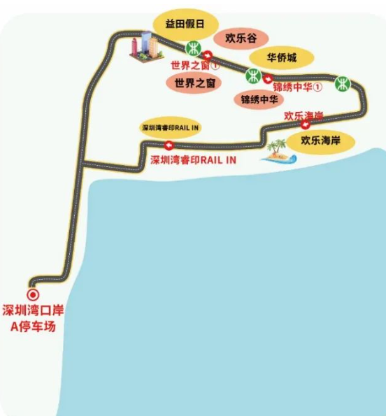 消费文旅B线:深圳湾口岸A停车场→世界之窗①(欢乐谷、益田假日广场)→锦绣中华①(华侨城、锦绣中华)→欢乐海岸→深圳湾睿印RAIL IN→深圳湾口岸A停车场
