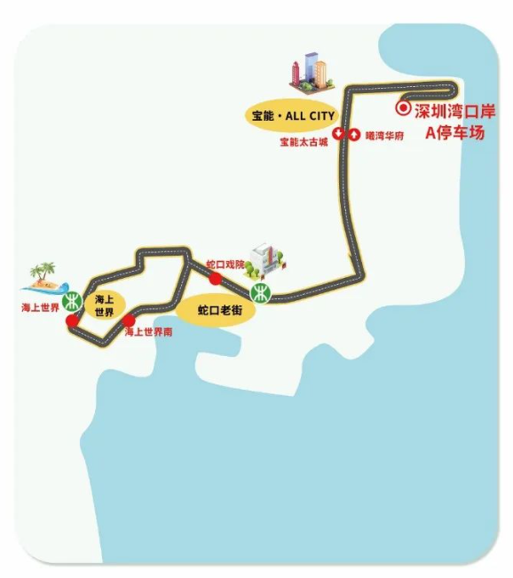 消费文旅C线:深圳湾口岸A停车场→宝能太古城(宝能·all city)→蛇口戏院(蛇口老街)→海上世界南(海上世界)→海上世界地铁站→蛇口戏院(蛇口老街)→曦湾华府(宝能·all city)→深圳湾口岸A停车场
