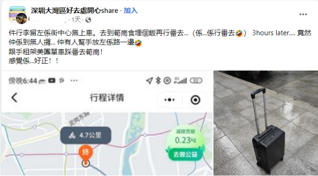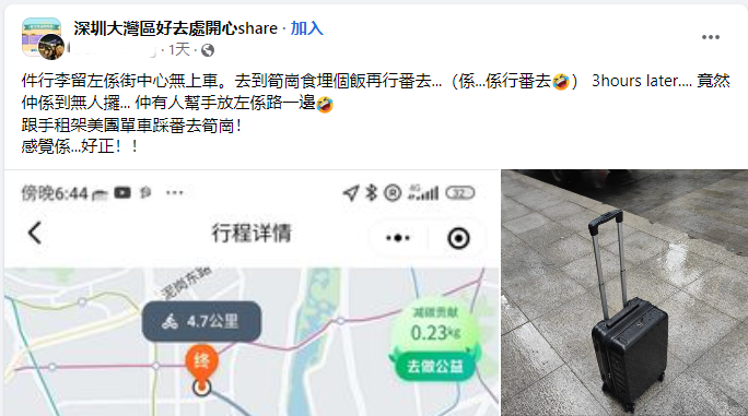 网友惊喜之馀,随即租了一辆共享单车,带上失而复得的行李箱再去笋岗,直言“感觉好正(好棒)!”