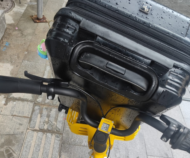 从网友上传的照片可见,其把黑色的小型行李箱放在了共享单车的车篮裡;4.7公里的距离,租共享单车的费用亦仅花费其3.5元人民币。
