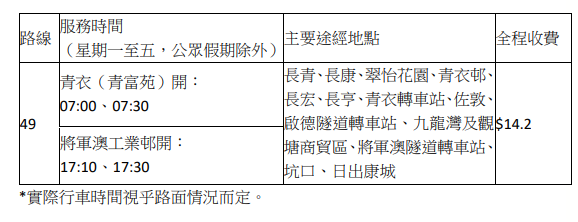 九巴续指,49线早上繁忙时段由青衣(青富苑)开出两班车前往将军澳工业邨,亦会于下午繁忙时段开出两班回程车由将军澳前往青衣。