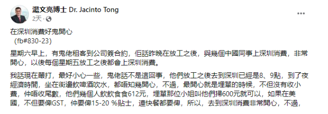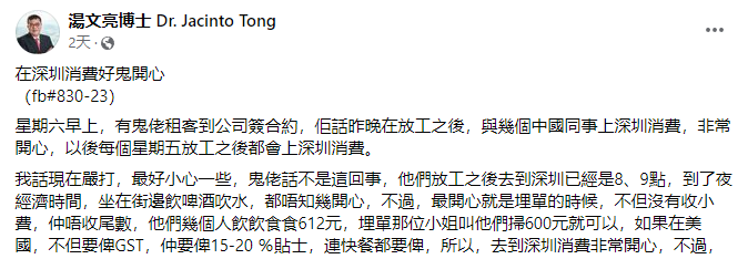 近日,香港纪惠集团副主席及行政总裁汤文亮在社交平台发文爆料,称自己的外国租客北上消费后十分开心,放言以后每周五收工后都要去深圳。