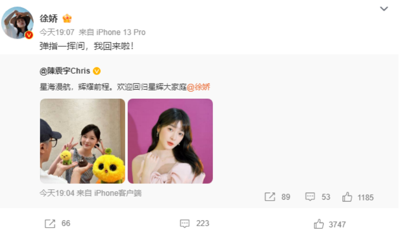 电影制作人、资深经理人陈震宇今日(19日)在社交平台微博发文,官宣艺人徐娇回归周星驰公司。徐娇随后转发微博说“我回来啦”,文中还配有徐娇与周星驰同框合照,可谓满满回忆杀。