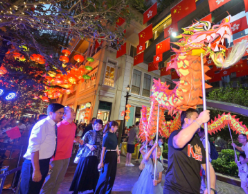 适逢中秋国庆双节日,全港各处都充满欢乐气氛。近日湾仔利东街挂满了七彩缤纷的中秋大灯笼,亦悬挂了国旗区旗贺国庆,吸引不少市民前往打卡。财政司副司长黄伟纶昨晚专程前往凑热闹,更与参加商场“舞龙文化体验”的市民拍照,大小朋友一边体验舞龙的乐趣,一边认识这项传统文化,玩得非常尽兴。