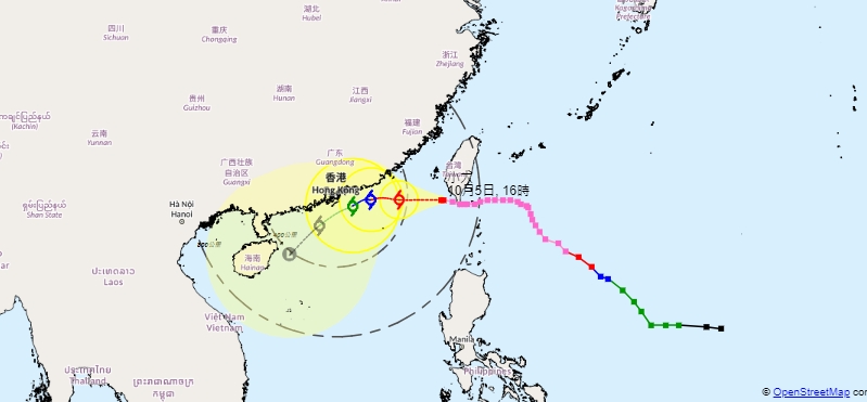 一号戒备信号现正生效。天文台今日(5日)表示,过去数小时,热带气旋小犬横过台湾南部,进入台湾海峡,强度有所减弱。天文台表示,会考虑在明晚至周六上午改发三号强风信号。