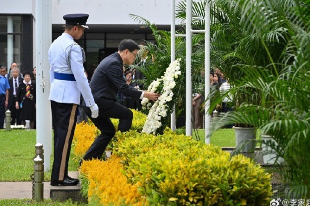 李家超表示,他献上花圈向二战英烈致以最崇高的敬意,永远铭记于战争中壮烈牺牲的英灵和死难同胞。