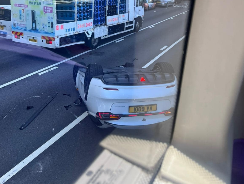 铜锣湾发生交通意外。今日(24日)上午11时39分,一辆Tesla电动车沿告士打道往中环方向行驶,至近景隆街交界时,与一辆运送蒸馏水的货车相撞,电动车全车翻转四轮朝天,据报车上有人被困。