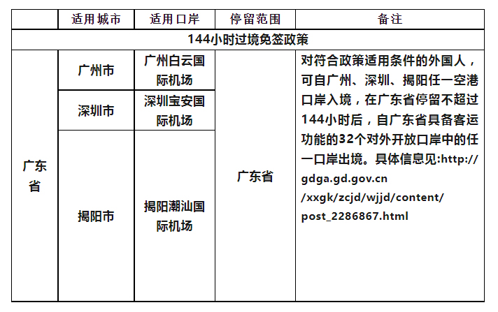 如外国人符合上述条件,可向广州、深圳边检机关(揭阳空港口岸由深圳边检机关管辖)提出办理144小时过境免签申请,其他城市暂未实施该项政策。