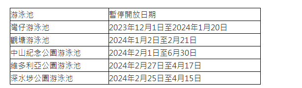 秋冬游水都唔怕!康文署冬季期间(即11月至明年3月)提供全港各区共二十八个提供暖水游泳设施的游泳池,方便市民在冬季继续勤做运动。署方呼吁市民在享受游泳乐趣之馀,要注意安全,顾己及人,保持公众泳池清洁衞生。但需注意,有部份游泳池将进行保养以及维修工程,于部分时段暂停开放,详细如下: