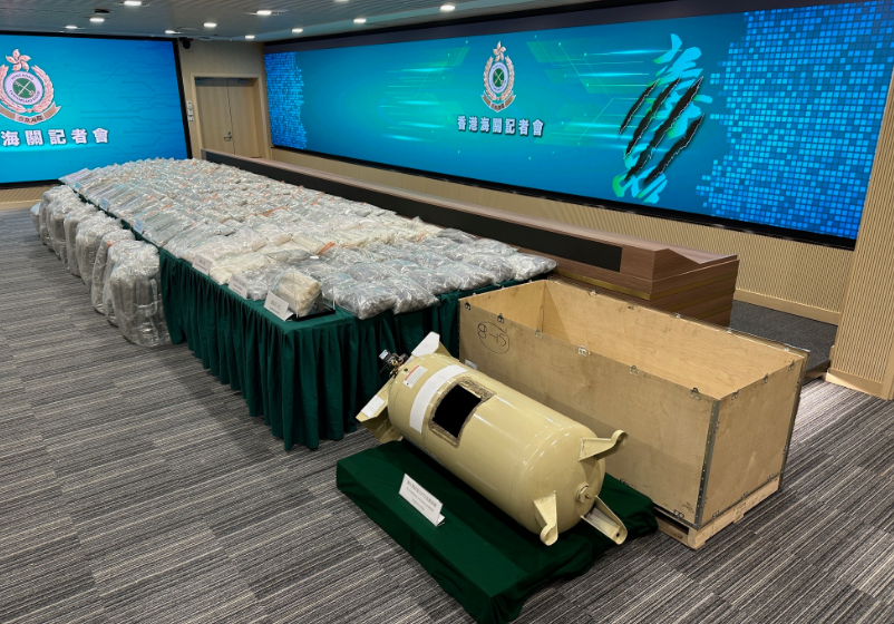 透过风险评估及情报分析,海关10月25日于青衣海关验货场检查一个从北美地区抵港,报称载有15个空气压缩机的40呎海运货柜。经查验后,海关人员在这15个空气压缩机内,检获约484公斤各类型毒品,包括约311公斤怀疑大麻花、88公斤怀疑冰毒、82公斤怀疑亚甲二氧基甲基安非他明(俗称“摇头丸”),以及3.2公斤怀疑芬太尼,估计市值约1.4亿元。