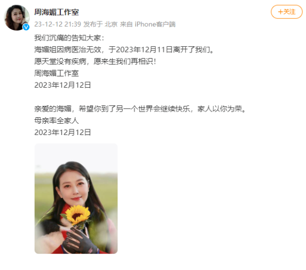 海媚姐因病医治无效,于2023年12月11日离开了我们。