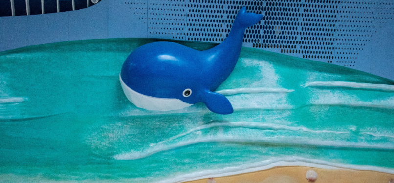 以海蓝色鲸鱼为主题的艺术品陈列,为大梅沙站艺术空间增加了一番童趣。市民可以在站厅层和随浪花摆动的“鲸鱼”打招呼,亦可以坐在站台层的鲸鱼长椅上小憩。车站出入口以鲸鱼为原型,通过牆面及檐口线条,和侧立面内嵌的玻璃,刻画出神似鲸鱼嘴的形态。“鲸鱼嘴”及通透的天窗,打通地上空间与地下空间的联繫,将海滨公园多层次立体景观空间延伸至地下车站内,营造出潮韵浪绵山海的意境。
