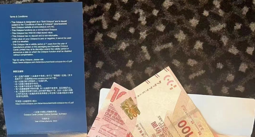 社交平台小红书日前有多篇帖文,称特区政府大派送,旅发局在会展设摊位,每人可领取200元现金加八达通。图片可见,获得的纪念版八达通卡印有“Hello Hong Kong”,左下角为旅发局旗下“香港会议及展览拓展部(MEHK)”的标志图案,而包装纸提醒卡内已储值100港元,可用于公共交通、娱乐设施、零售及餐饮商户等。至于两张100港元则放在一个白色信封中,连同八达通储值金额,合共送出300元。