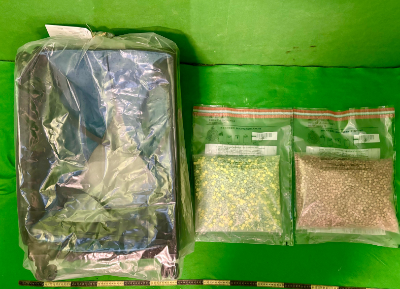一名50岁男旅客今日从法国巴黎飞抵本港。海关人员替他进行清关时,发现其寄舱行李内的夹层藏有该批怀疑摇头丸,遂把他拘捕。