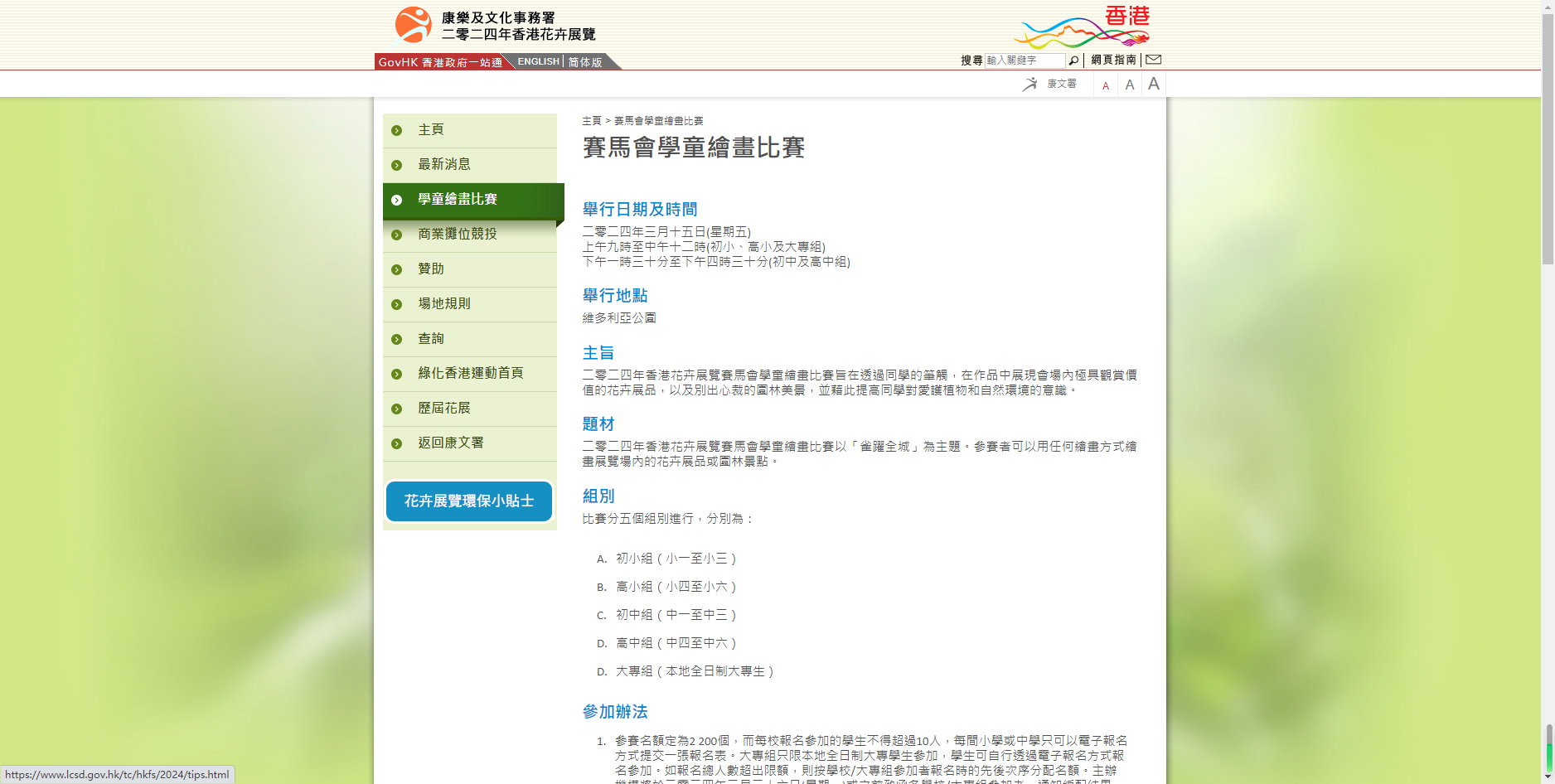 查询比赛详情,请致电2724 3815或浏览花展网页。中、小学生须透过所属学校报名参加,而大专生可自行报名参加。参赛学校及大专组参加者须于2月1日或之前,在网上填妥并递交报名表。
