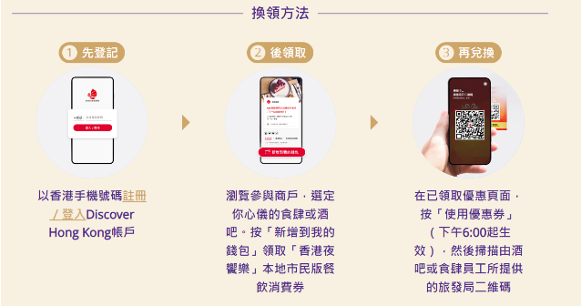 在已领取优惠页面,按“使用优惠券”(下午6:00起生效),然后扫描由酒吧或食肆员工所提供的旅发局二维码。