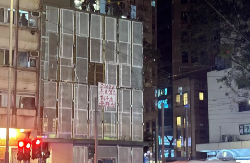 据读者提供消息指,现场为轩尼诗道马师道一栋正在维修中的大厦,有人在外牆贴出“荣利丰展 无良僱主 有汗出 无粮出”的横幅,疑似为追讨欠薪企跳。消防接报到场,打开气垫戒备,事件引起不少途人围观。