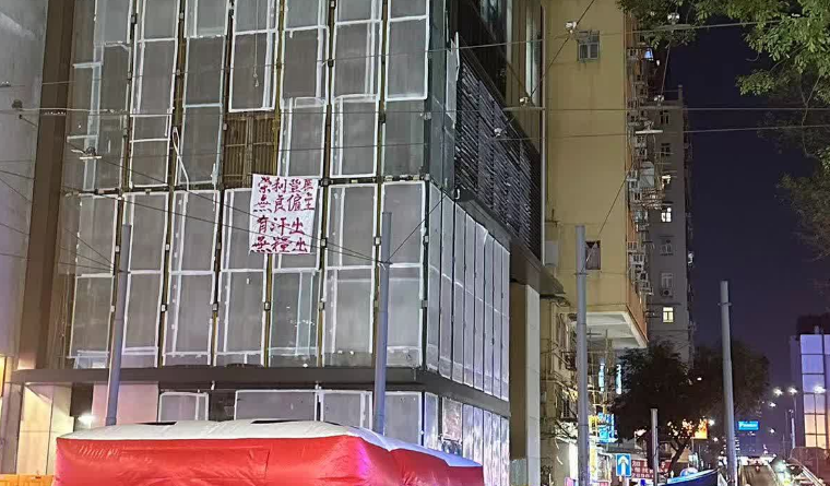 点新闻收到读者爆料指,湾仔轩尼诗道马师道附近一栋大厦今(10日)晚有人贴出横幅追讨血汗钱疑似企跳,消防接报到场展开气垫戒备。