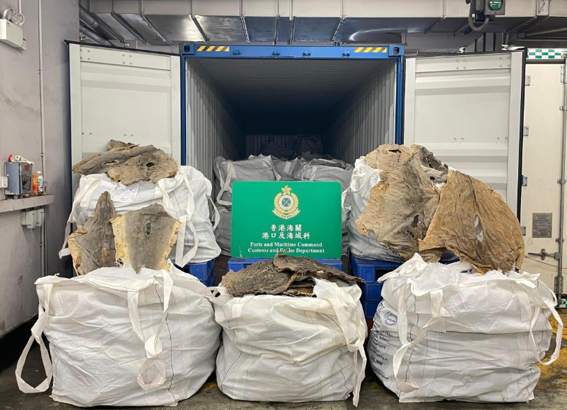 海关人员昨日透过风险评估,拣选及查验一个从阿曼抵港的40呎海运货柜,并在货柜内发现该批怀疑受《条例》管制的乾鲨鱼皮及乾鱼翅,案件已转交渔护署跟进。