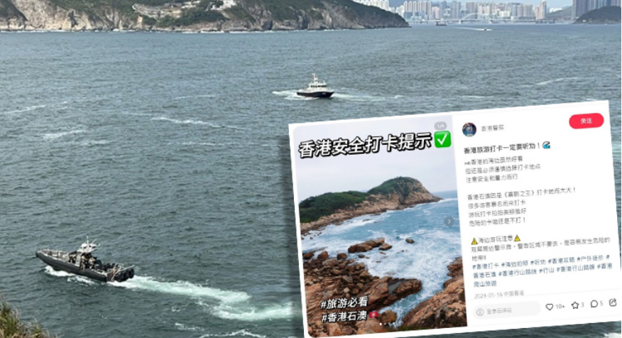 本月14日石澳发生遇溺惨剧,来自深圳的一行6人于石澳山仔路行山,期间一名57岁女子在崖边打卡时,疑遭大浪捲走堕海,其61岁兄长及55岁三弟随即跳海救人,惟3人同时遇溺,最后二姐及胞弟获救时已昏迷,送院抢救后最终不治。警方昨日(16日)在内地社交平台小红书发布香港安全打卡提示,呼吁来港旅客要小心,“危险的卡咱还是不打”。