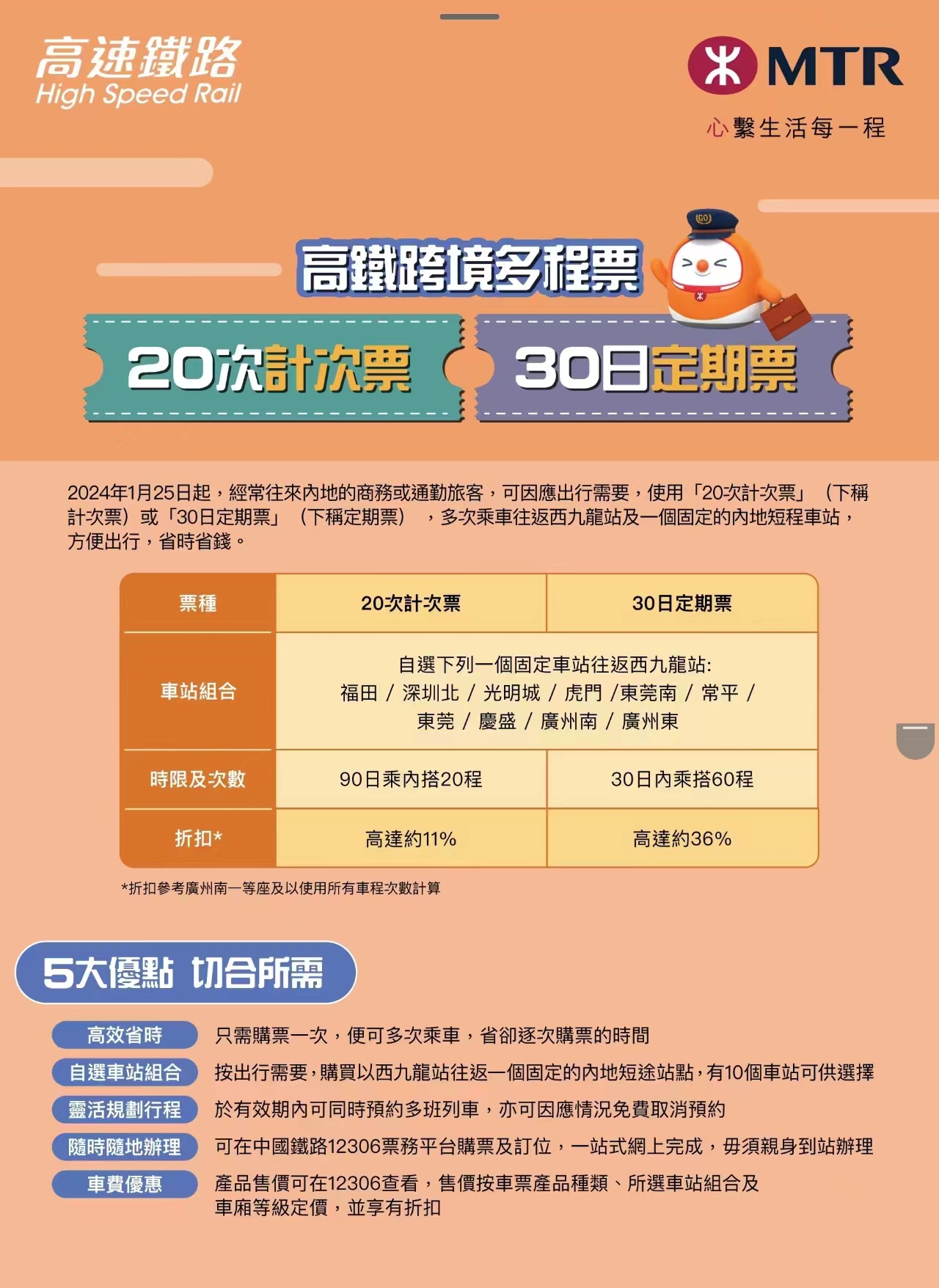自去年1月广深港高铁复通以来,受到跨境乘客欢迎,2023年全年发送旅客突破2000万人次,刷新开通以来纪录。为进一步便利频繁往返粤港两地的乘客,满足多样化出行需求,广深港高铁自今日(1月25日)起推出20次“计次票”和30日“定期票”,相比于普通购票,可享受一定的折扣。