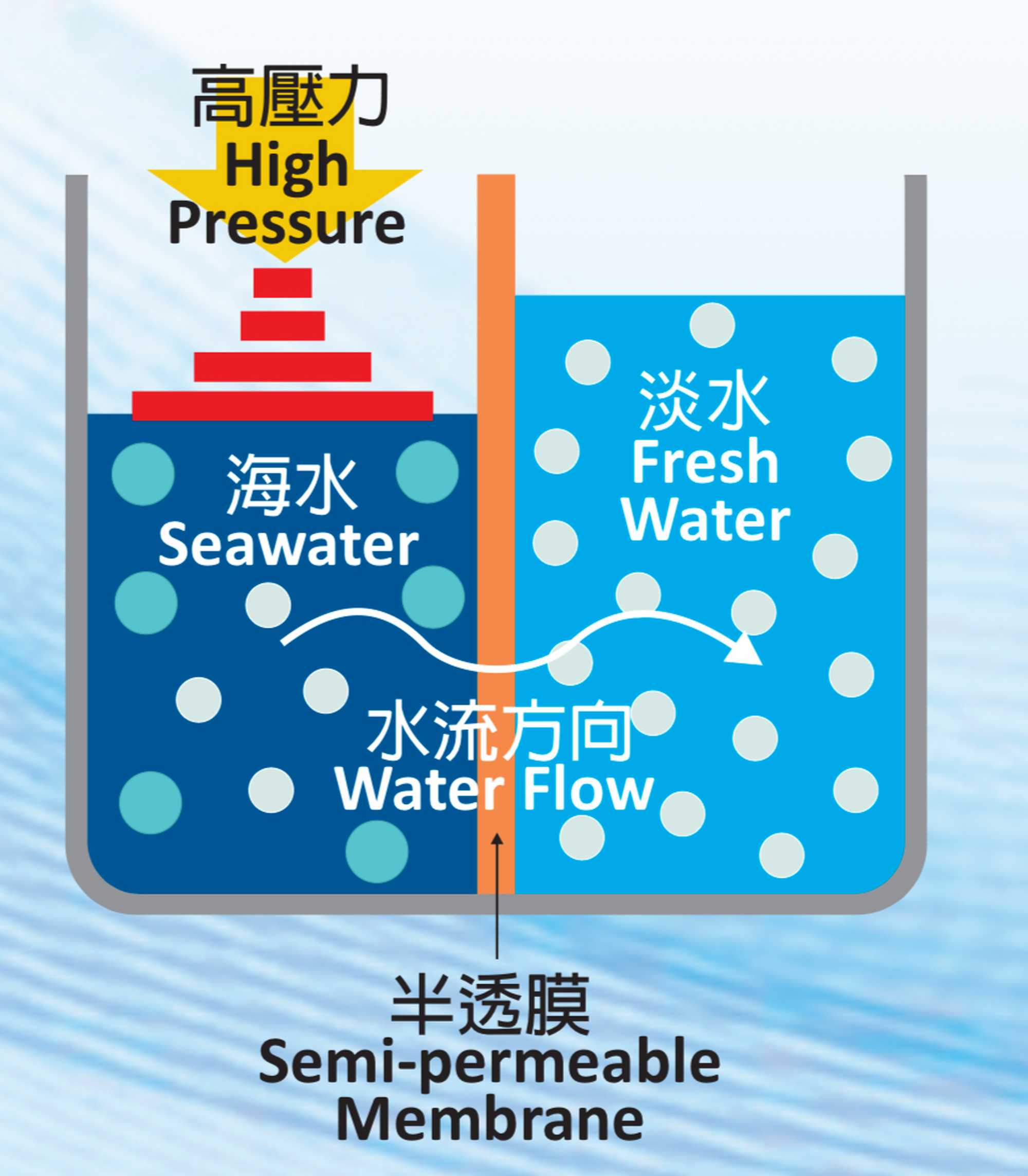 海水化淡的四个主要处理过程为:隔筛、前处理、逆渗透淨化和后处理。首先进行“隔筛”和“前处理”,以防止海洋生物进入设施,并过滤清除杂质和悬浮粒子等,其后利用“逆渗透”技术去除盐分、杂质和微生物。