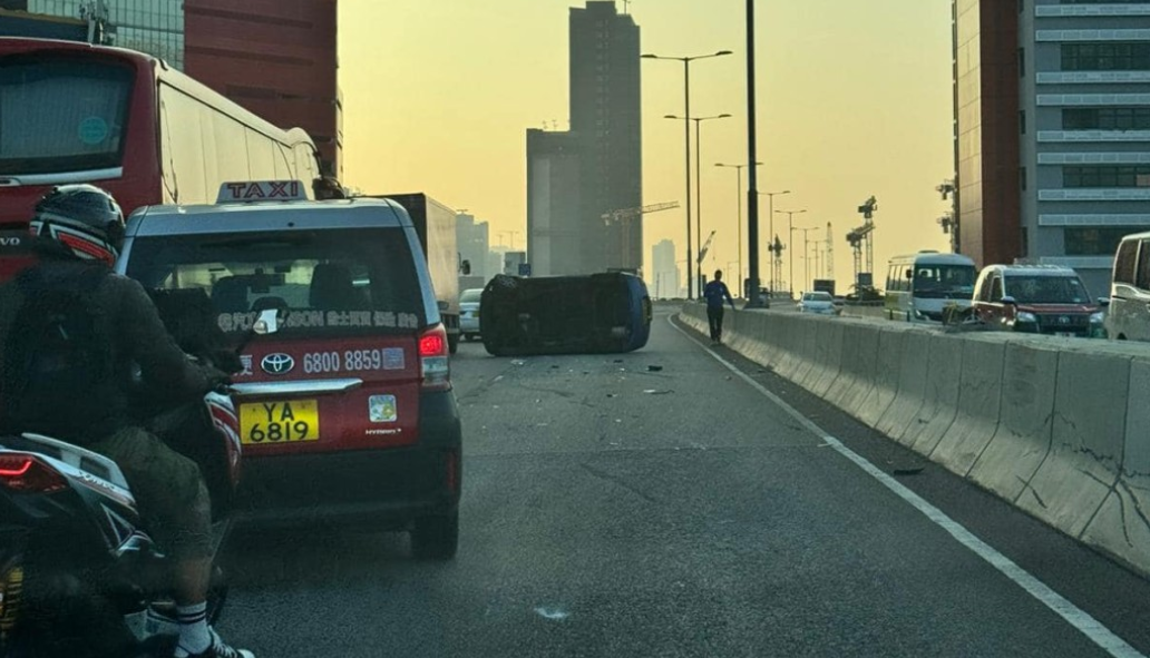 九龙湾国际展贸中心对开今日(16日)早上7时43分,一辆私家车沿观塘绕道往观塘方向,驶至上址对开时,私家车突撞壆后翻侧,打横搁在路面,姓陈(32岁)男司机自行爬出车厢,他并无受伤,救护员接报到场,他经检查后拒绝送院。