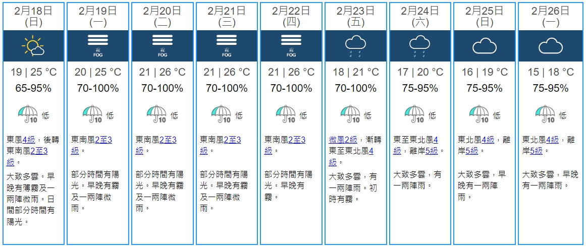 不过,本港下周后期气温将急降。天文台预料,下周五(23日)最低气温料为18度,与前一日最高温26度相比,一夜跌了8度。随后几日气温进一步下跌,预料2月26日星期一最低气温仅15度。