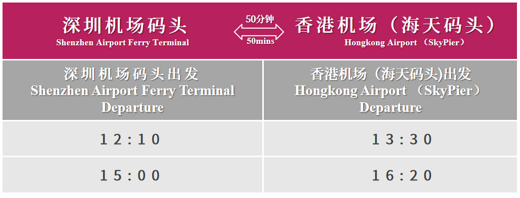 整趟航线仅须50分钟,无须入境香港,直接进入香港机场控制区,通过安全检查领取过境退税后,搭乘旅客捷运系统(仅须约3分钟)进入香港国际机场1号客运大楼登机离港。