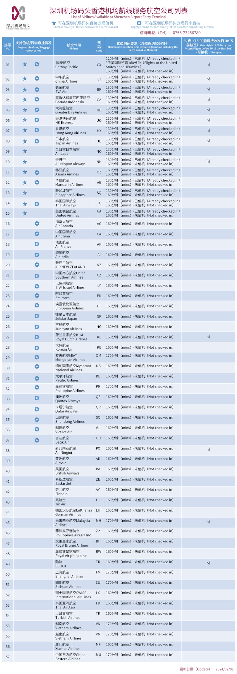 距船班出发时刻提前60分钟抵达深圳机场码头候船楼1号门,进入至5-9号售票及值机柜檯进行船票、机票确认,部分航司可提前在深圳机场码头办理值机手续。