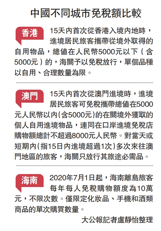 全国人大常委李慧琼也在赴京之前表示,早前提出将内地客免税额提高到3万元的建议,得到部分人大代表支持。这是参考了一个智库的研究而釐订额度,认为内地居民生活水平改善,维持多年的5000元免税额有需要提高,认为即使争取到免税额提高至3万元,都是一个突破。她赴北京出席两会期间,亦会约见税务专家等有关人士,研究提高免税额的可行性。
