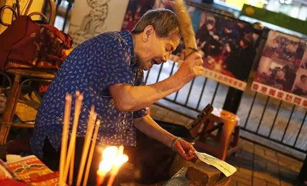 拜神婆念念有词“打你小人头、打到你有气无掟唞……”,并用力拍打两张小人纸,直至毁掉成纸碎。