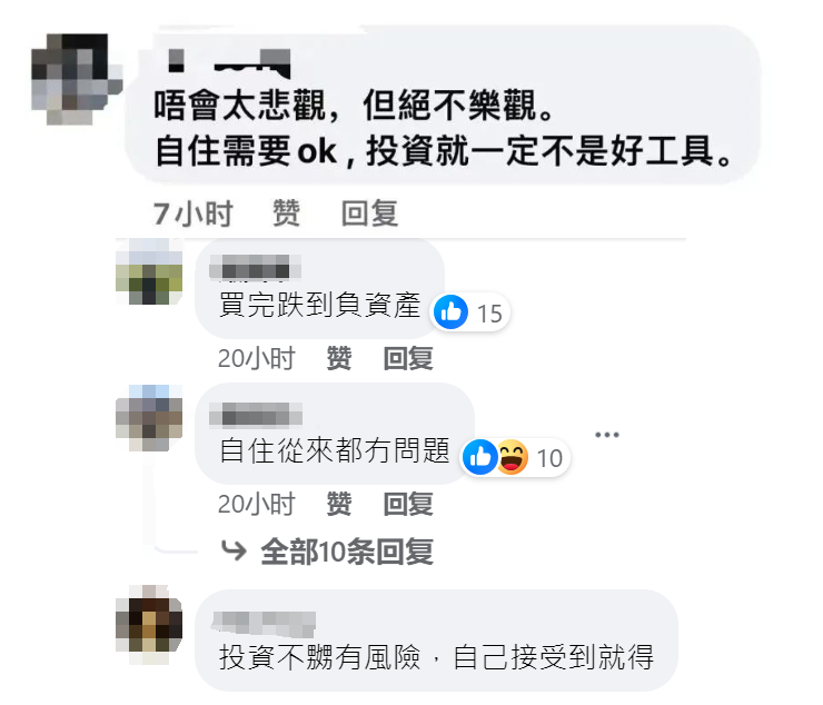 对此,网友反应不一,有人担心之后楼价还要跌,而有人就认为自住不怕,还有人说,投资一向都有风险,自己能承受就好。