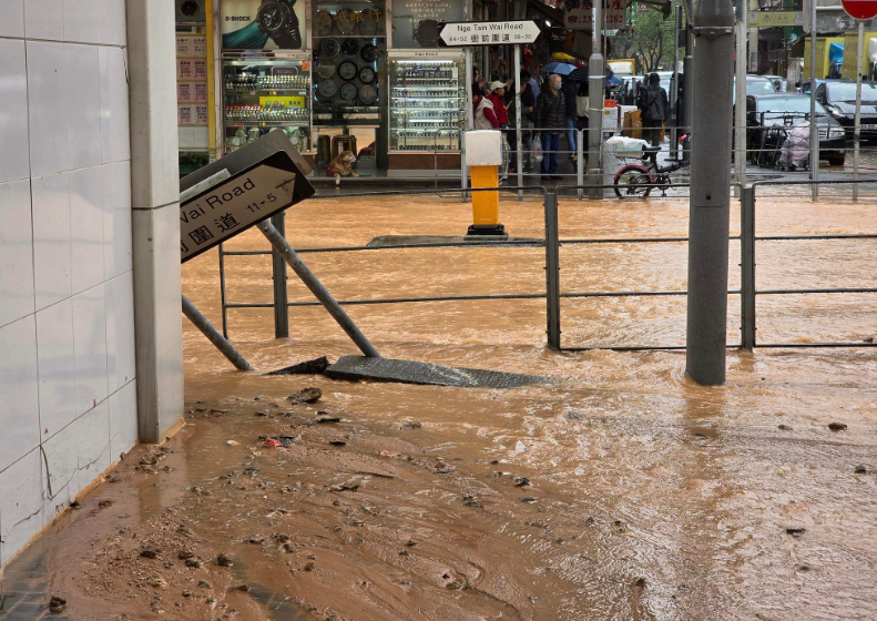 今日(11日)下午1时42分,九龙城衙前围道及城南道交界发生爆水管,大量黄泥水涌出,淹浸十字路口,且地面凹陷致街牌倾斜。