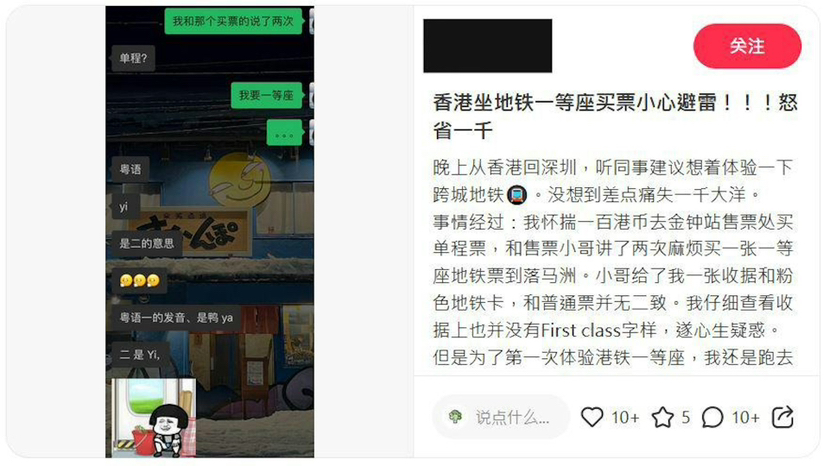 该内地女于小红书以“香港坐地铁一等座买票小心避雷!!!怒省一千”为题发文讲述事件,大叹“听同事建议想着体验一下跨城地铁,没想到差点痛失一千大洋”。楼主表示,她周一(3月18日)晚上从香港返回深圳,依据同事建议想体验“跨城地铁”,于是拿着100元到港铁金钟站售票处买一张“一等座(头等车厢)”单程票到落马州,“和售票小哥讲了两次麻烦买一张一等座地铁票到落马洲。小哥给了我一张收据和粉色地铁卡,和普通票并无二致。”
