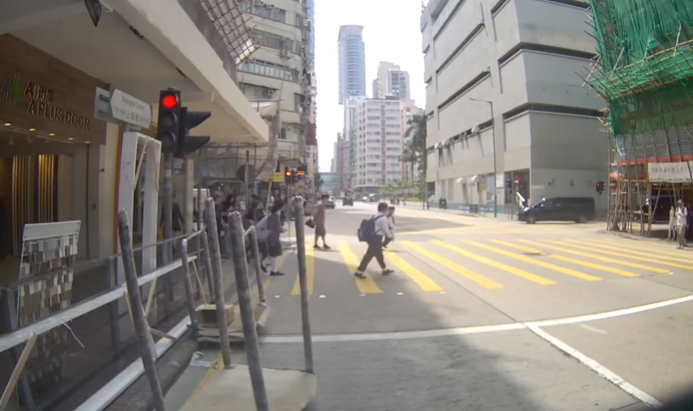 网上22日流传一段车Cam片段,显示旺角上海街有一名柱着拐杖的婆婆于行人绿灯时步履蹒跚过路,惟行人灯转红,婆婆只走到斑马线一半,进退不得。不少车辆等不及婆婆,开车从其身边驶过,险象环生。见此险象,旁边一名男子行到斑马线,主动搀扶婆婆回到行人路安全位置。