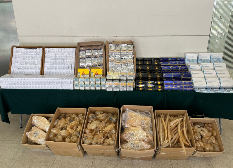 海关21日在港珠澳大桥截查一辆离境货车,检获一批怀疑走私物品,包括约25公斤乾鱼肚、约127公斤烟草产品及约3500盒药剂制品,总值200万元,当中包括壮阳糖及爱滋药。