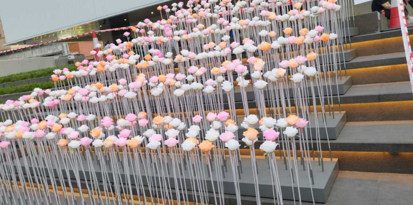 东九文化中心外阶梯LED玫瑰花海正在施工期间,日前网络热议,白日下满满的“白玫瑰”似“灵堂”。不过昨日(23日),玫瑰花海中加添橙色及粉红色的LED花,令画面和谐美观不少。