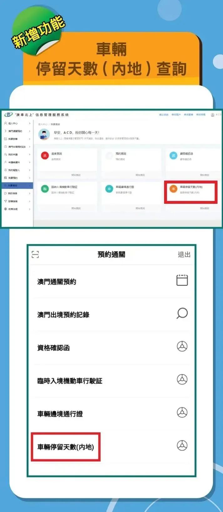 目前,“澳车北上”系统会以短信和电子邮件通知临近停留期限的车主,并设有车辆停留天数(内地)查询功能,申请人可在“澳车北上”网页版和App进行查询,更好地掌握车辆的停留天数资讯。