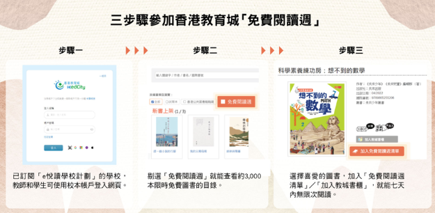 为推动“爱阅读.乐分享”氛围,教城将于4月23日至29日,一连7天推出“免费阅读週”,协助学校推展广泛阅读,同时扩阔儿童及青少年阅读面。于“免费阅读週”期间,教城将开放“e 悦读学校计划”多个收费阅读组合,供中、小学生阅览。是次活动获超过40间本地及海外出版商支持,在“免费阅读週”内豁免收取超过3000本电子书费用,共同响应“世界阅读日”及“香港全民阅读日”。