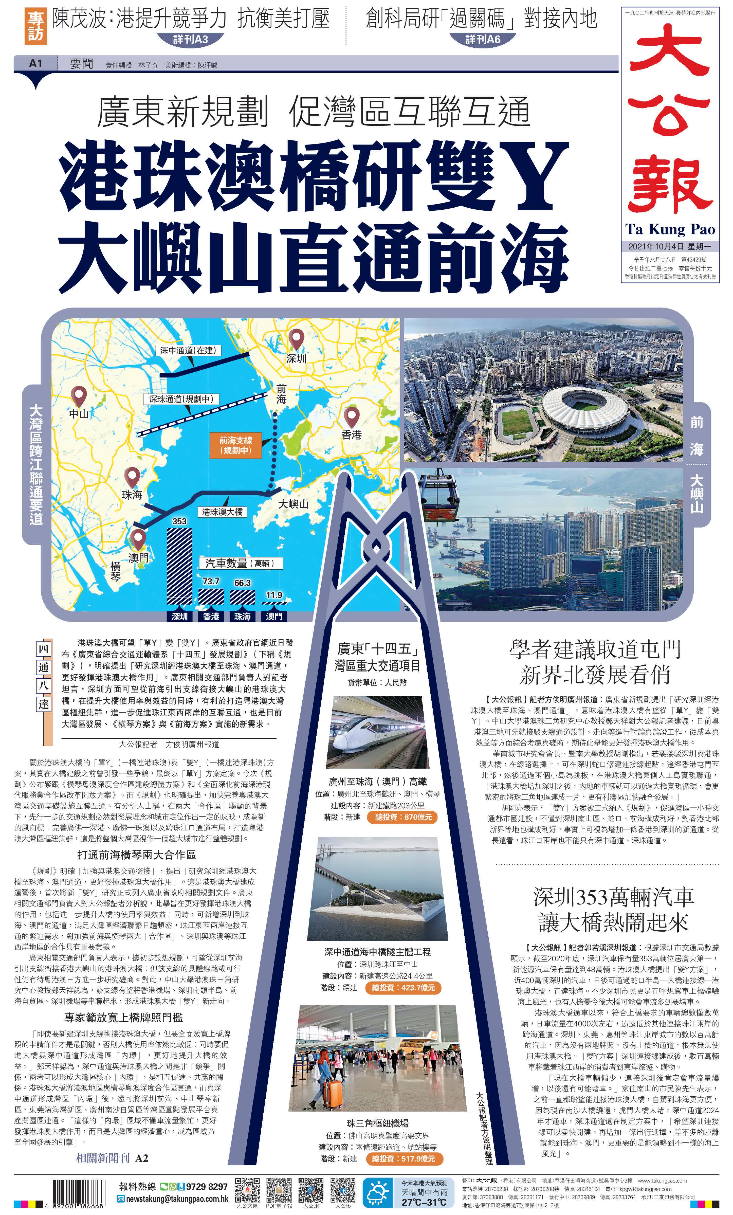 大公报持续关注港珠澳桥“双Y”方案最新动态。这是大公报2021年10月4日头版报道相关消息。