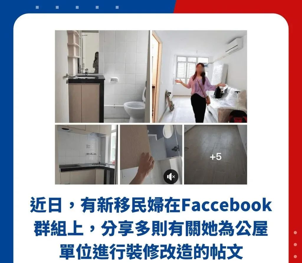 近日,有新移民妇在Faccebook群组上,分享多则有关她为公屋单位进行装修改造的帖文。事主表示她于3月初获派大埔富蝶邨的公屋单位,并花了数万元进行装修,当中包括铺地砖、安装厕所及厨房用具、配置地柜等工程。